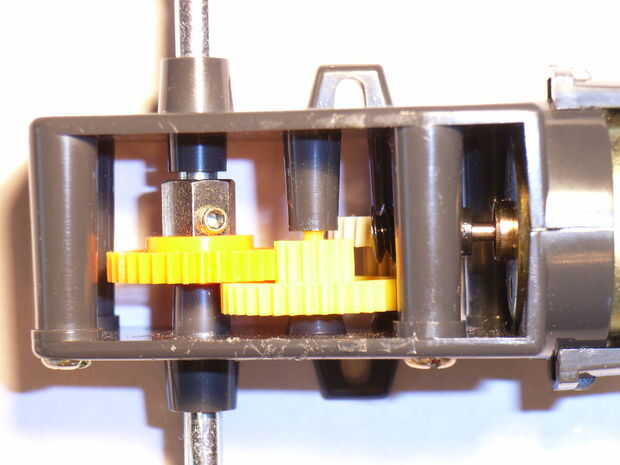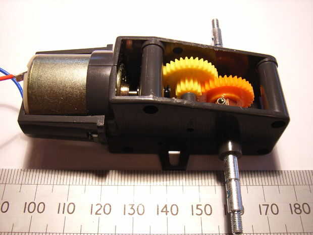 caja de engranajes de gusano 72004 Tamiya para un robot que estoy construyendo. Para ello debe tener alguna forma de medir la velocidad de la corriente. Este proyecto muestra la evolución de los sensores de velocidad. Como veis en la foto, el motor conduce un engranaje de gusano conectado directamente a su eje, a continuación, una serie de tres engranajes para reducir la velocidad al final del eje de salida.