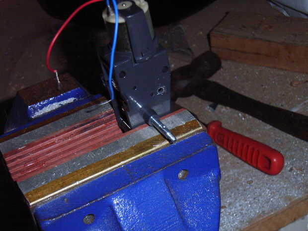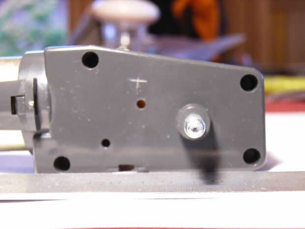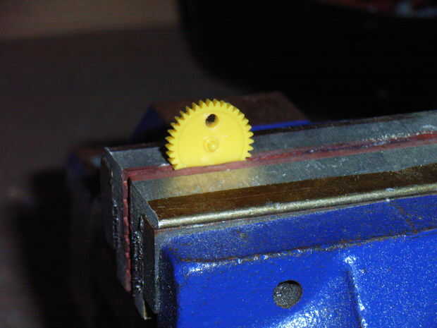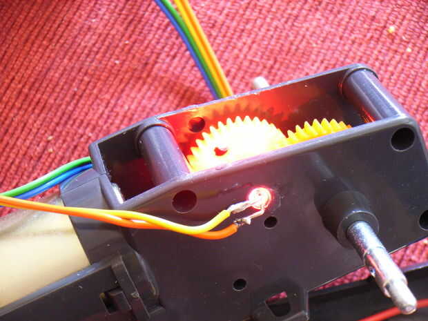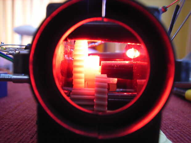 El primer método que probé utiliza un LED rojo de alta intensidad y un fototransistor. Perforé dos agujeros en el engranaje de la segunda pasada en el tren de engranajes y dos orificios en la carcasa de la caja de cambios. Esto me dio unos 5 pulsos por revolución del eje de salida. Me alegró que funcionaba.