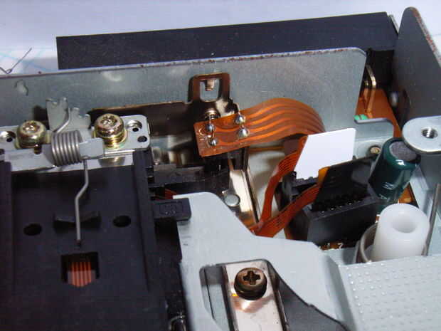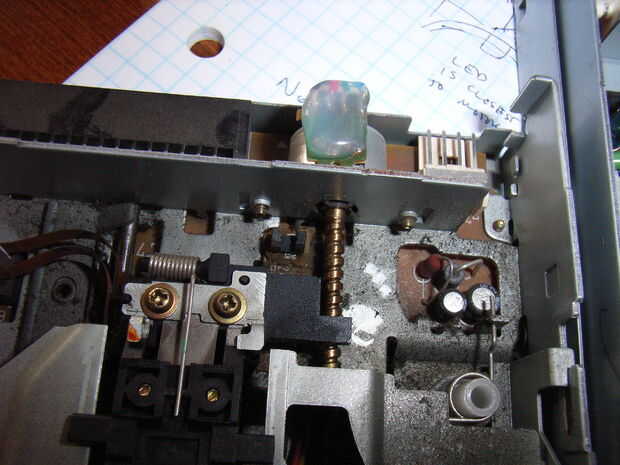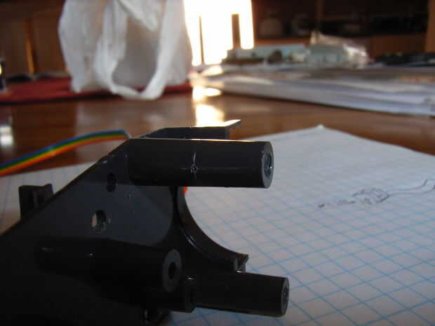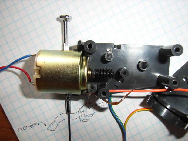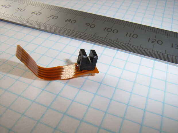decidí que tenía que poner el sensor en el motor sí mismo, antes de cualquier engranaje de reducción, para que yo pude capturar muchos pulsos por revolución de la salida, y resultó no ser tan difícil como pensé. El diseño final utiliza una paleta montada directamente sobre el eje de salida del motor. Encontré un interruptor opto ranurado pequeño dentro de un viejo 3.5" floppy drive y monta sobre el eje del motor. Había pegado una tuerca M2.5 al engranaje de gusano en el espacio entre el engranaje y el frente del motor, luego había pegado un pedazo de plástico negro de 4 mm x 5 mm y uno de los pisos de la tuerca. A medida que el motor gira una serie de pulsos son generados por el sensor.
