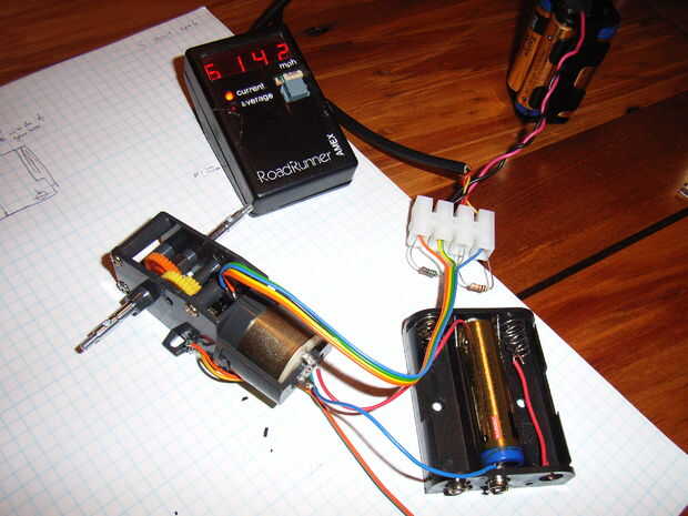 El último paso es conectar el LED y el fototransistor a tu microcontrolador o a otros circuitos. Usé una resistencia de 150R para limitar la corriente en el LED y una resistencia de pullup de 10K en el colector del fototransistor. La foto de abajo muestra el motor es accionado con una sola batería AA, y su velocidad se mide en un tacómetro que construí. 6142 rpm es la velocidad que cabría esperar, teniendo en cuenta las especificaciones típicas de Tamiya. Cada motor será diferente, pero la velocidad del motor se puede controlar con precisión midiendo la velocidad de la corriente y variando la tensión de alimentación.