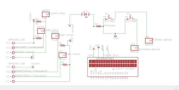 Yo te lo haremos saber los pines adecuados. Primero trabajé en la pantalla LCD, encontré un ventilador con un conector de 4 pines podía robar para ir la la parte trasera de la LCD, si no tiene uno cuidadosamente soldar un cable a cada pin de la pantalla LCD. Te recomiendo un conector para una fácil extracción. Configurar toda la electrónica en los conectores de fácil separación y reemplazo. Vas a querer conectar el pin SDA en la pantalla para el pin SDA en el Arduino y el pin SCL para el SCL en el Arduino. Por ahora es más fácil dejar el VCC y GND se pierden. Luego suelde una resistencia de 1 k (cuenta con la mayoría LED de 300 ohmios hasta un 2k va a funcionar) para el cable de negativo de lo LED se debe un ser un pin más corto, con un lado plano. Si nos fijamos en el LED el plomo negativo o (electrodo) es mayor que el positivo (ánodo). Ejecuta un cable desde el otro lado de la resistencia a un lado de uno de los botones y de la soldadura, ejecute un cable de esa conexión a un lado del otro botón y de la soldadura, dejar un plomo el extremo a tierra. Ahora ejecuta un cable desde el lado positivo del led, déjalo colgar perder para conectarse más tarde. Ejecutar lleva positivo separado para cada botón, no les huyas en secuencia. A continuación añadir en los conectores de cuatro cables en el lado de la caja de proyecto o alternativamente un conector serie es agradable con su conector de 9 pines y no cruzado. Usé 2 pernos de cuatro, sobre todo porque quería ser capaz de mover cosas fácilmente. Tomar dos cables de 4 pines, suelda un alambre y una resistencia 4.7 k un cable y un cable y la resistencia de 10 k a la otra. Asegúrese de que el cable está más cercano al conector de la resistencia de entonces y luego soldar entre sí los lados opuestos de ambas resistencias. En el otro conector soldar dos cables y dos 10 k resistencias en dos de los conductores de la misma manera que hicimos el último pasan y soldar las resistencias entre sí en el otro extremo. Ahora estamos listos para conectar todo, vamos a trabajar con los cables de positivo ya que hay sólo una salida de 5v de Arduino pero hay 3 motivos. Tomar la resistencia k 4.7 que se une a los 10k, el positivo del LED, el cable de VCC en la pantalla LCD y un cable no utilizado de cada uno de los conectores de 4 pines y fije soldadura juntos, conectar otro cable y funcionar a 5v positivos. Luego tomar los otros dos pierden 10 resistores de k y sujete a un recinto en el Arduino. A continuación toma el cable de tierra de la resistencia del LED la tierra de los pulsadores y el suelo de LCD y soldadura a un alambre, ejecutar ese alambre en un campo en el Arduino. Tomar la final dos olvídese de cables de los conectores de 4 pines y sujete a la última planta. Tome el cable de la k de 4,7 que se adjunta más cerca al conector y ejecute a la clavija 3 en Arduino esto es para los sensores de temperatura one-wire. La resistencia k 10 adjunta al 4,7 k tiene un cable, así que los cables al pin 2, esto es para el sensor de flujo. Siguiente tomar los dos pierden de alambre de las dos 10 k conectado a tierra y ejecutarlos a A0 y A1 son para los termistores. La última cosa en este paso es conectar los cables de los botones a los pines 5 y 6. Viola que todos los cables están conectados a la Arduino, coloque la pantalla LCD para el conector del ventilador de 4 pines si usaste uno y si quieres te puede cerrar el caso. Lo dejo abierto en caso de que uno de los sensores no está leyendo. Probablemente significa que algo se cruza. Envuelvo mis conexiones en cinta aislante para evitar cortocircuitos.