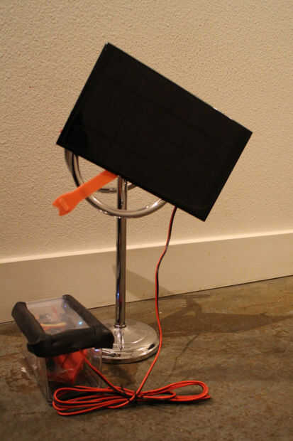 El soporte en este ejemplo es un toallero en una tienda local. Esto era perfecto para mis necesidades porque 1) era muy barato y 2) los anillos son ajustables, que me permite cambiar la orientación del panel solar para que apunte hacia la máxima radiación solar incidente (también conocido como luz del sol) dependiendo de donde está instalado al aire libre y la temporada actual (desde cambios de ruta del sol según las estaciones).