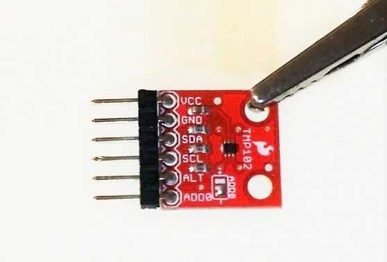 3. soldadura de pernos de encabezado para el sensor de temperatura SparkFun (TMP102).