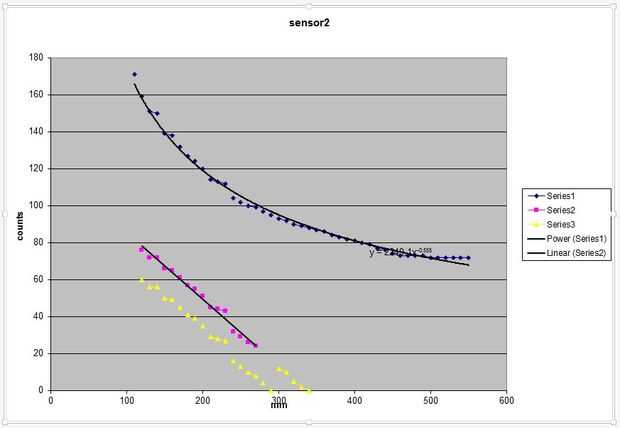 Cada sensor de rango de GP2DO2 tiene características de salida ligeramente diferente. Añadido a este problema es que la salida también es no lineal. El sensor de útiles para este proyecto, la salida del sensor raw tiene que medir en toda su gama útil, unos 550mm a 110mm y lineal. El objetivo es seleccionar un rango continuo de salida del sensor que puede utilizarse para representar los niveles de nieve de 0 a cerca de 6 pulgadas. El proceso de selección es parcial para proporcionar la mayor precisión en el rango de 1 a 3 pulgadas.