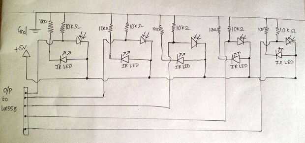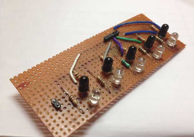 Siga estos pasos para los otros cuatro pares dejando aproximadamente 2cm entre cada par (esta distancia depende de la resolución que desee para el sensor y el espesor de la línea.)