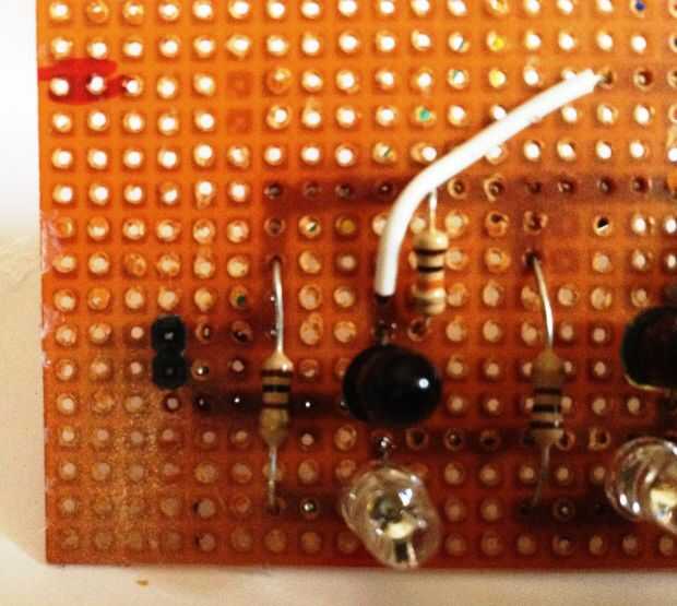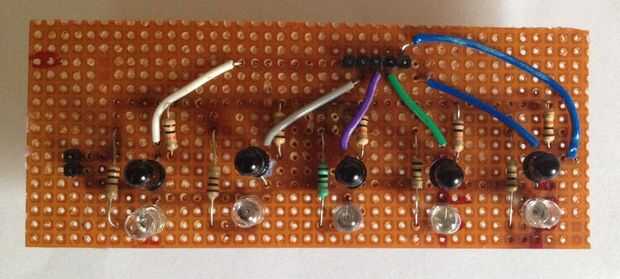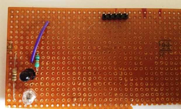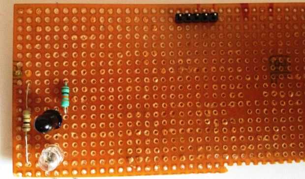 Ahora conectar un conjunto de 5 pines macho encabezado sobre el pcb... Tome un cable y Conecte cada ensambladura de la resistencia 10kΩ y el emisor a cada pin del encabezado. (Echar un vistazo a las fotos).
