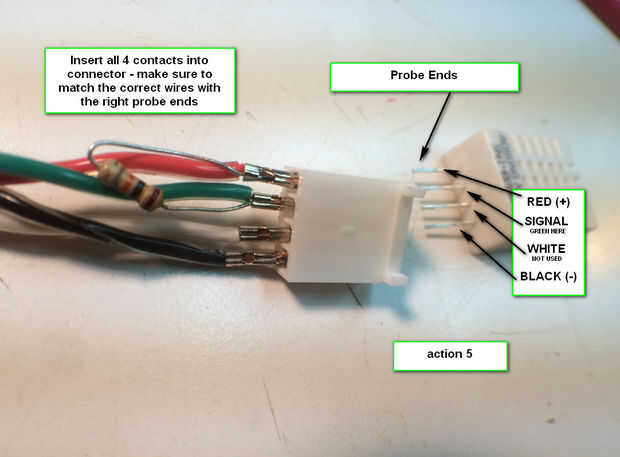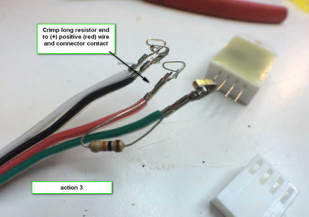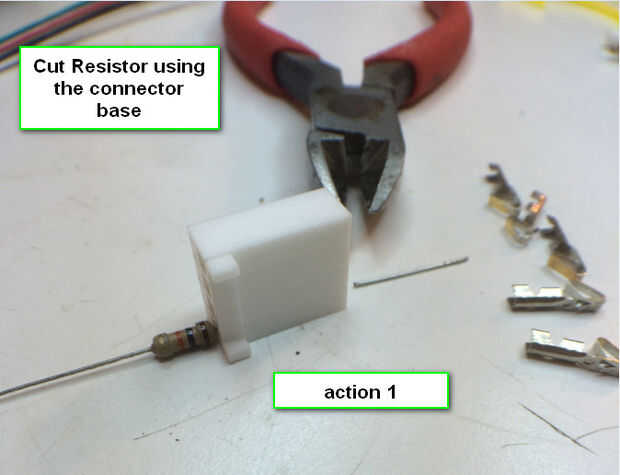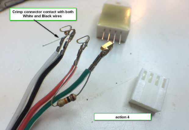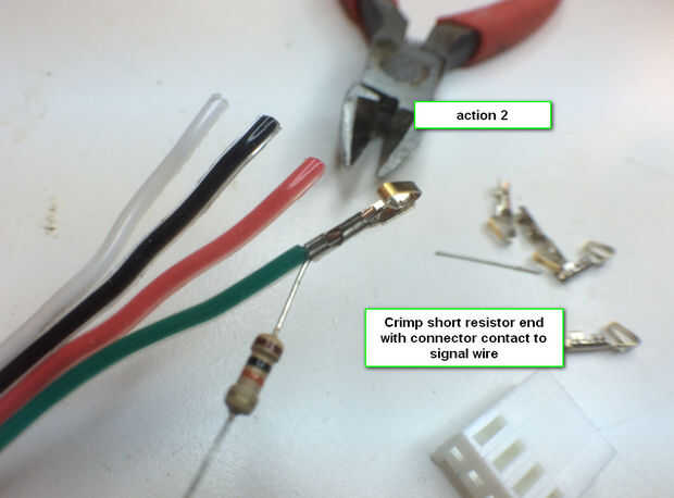 Prensar el extremo corto de la resistencia con contacto al cable de señal (verde en este caso)