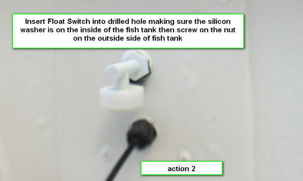 Inserte el interruptor de flotador en agujero asegurándose de que la arandela de silicona está en el interior de la pecera luego el tornillo en la tuerca en el lado exterior del tanque de pescados