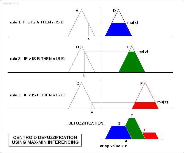 Hay tres etapas en lógica difusa: Fuzzificación, predicción y defuzzificación. Primero algo de Fuzzificación. Fuzzificación es proceso con el cual calculamos afiliación de entrada variable para una determinada población difusa o funciones de pertenencia. Puede haber muchas formas diferentes de funciones de membresía: trapecio, triángulo, Gauss,... En la etapa de predicción estamos utilizando determinado conjunto de reglas (las establecidas por el diseñador) para predecir lo que puede ser la salida o a que miembros función ápice variable afiliados qué nivel de salida. Este número no se puede utilizar como sienta. En la tercera etapa, defuzzificación, podemos combinar todos los niveles de afiliación a un solo valor. Este proceso se denomina también enfoque de valor de salida. Valor de salida solo puede utilizarse luego en la transformación posterior. Más sobre lógica difusa.