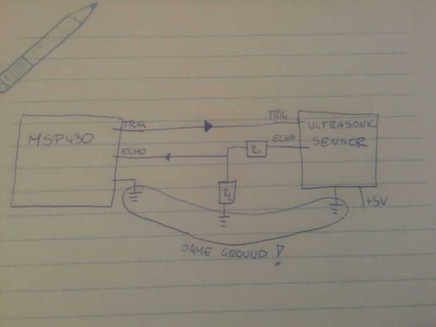 UPDATE1.0: Es un poco más complicado luego que tuve en el primer pensamiento. problema es, de hecho, ese sensor trabaja a 5V. Así que si quieres que funcione mejor, debe conectar la fuente de 5V en Vcc y GND del sensor. también, debe conectar el GND de MSP430 a GND del sensor y la fuente de alimentación GND. Y luego hay pin TRIGG y eco. Lo que sé, si hay un aumento de 3, 3V (MSP430) a 5V en el sensor (pin TRIGG), no hay ningún problema en cuanto a singal. Problema es con el pin eco, porque sensor salidas de señal de 5V a 3.3V del MSP430. así que tienes que usar un divisor de tensión en cable de ECHO. Estoy agregando un esquema que saqué en 20, pero se podría hacer el truco.