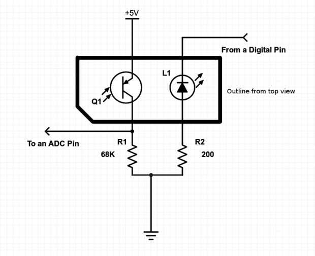 El fototransistor permitirá a través de él hasta 0.8mA, y queremos que esto sea 5V en el ADC. Esto significa que necesitamos una resistencia de 62K. El valor más cercano de la resistencia normal es de 68K, pero no tenía uno. Usé una resistencia de 100K chungo que leer 80K en un multímetro.
