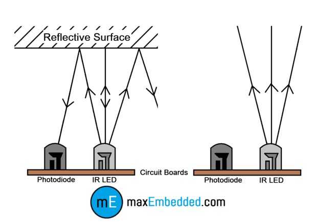 Cuando un objeto reflectante está cerca, IR más es recibido por el fotodiodo. El IR por el fotodiodo disminuye su resistencia, permitiendo que la corriente fluya. La corriente se detecta en la entrada sobre el Arduino conectado al circuito de analógica. Para determinar lo que es la distancia de un objeto desde el fotodiodo, necesitamos alternadamente nuestros IR LED encendido y apagado. El IR leyendo desde el fotodiodo cuando los LED están apagados determina la lectura ambiental de IR. El IR leyendo desde el fotodiodo cuando los LEDs se encuentran en determina la lectura IR de objeto.