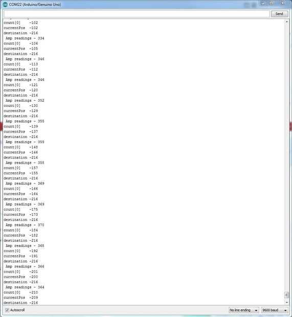 Para ello necesita una manera de saber cuando el motor está en sus límites. Aquí vamos a utilizar la detección de la corriente de la MegaMoto a ver cuando la corriente cae a 0. Cuando vemos que el actuador tiene golpear el interruptor de límite y detenido. Tenemos un pequeño contador corriendo ya que a veces la corriente puede denunciar a un falso 0. Asegurándose de que la corriente es 0 para una longitud del tiempo que sabemos que el motor realmente está en un límite y no obtener lecturas falsas.