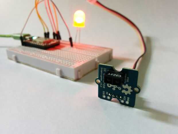 La interrupción de la distancia de IR es un sensor de proximidad emite una señal de alta cuando un objeto se coloca con en la gama para que el programa cargado en el núcleo de la partícula lee la señal y se enciende un led cada vez que la distancia de IR interrumpir da una señal de alto.