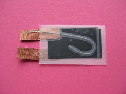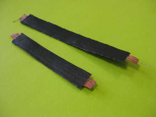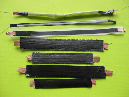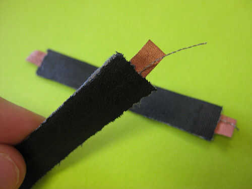 Básicamente sólo tienes que hacer bien la superficie conductora y el cociente de Velostat. Encontrar que los siguientes métodos funcionan mejor. Como hilo conductor poco según sea necesario para cubrir la superficie sensible. Para hasta una franja de dos cm de ancho, puede ser suficiente para tener un único subproceso corriendo por el centro de la tira y tres capas de Velostat entre cada hilo de rosca.