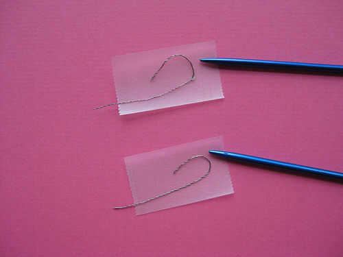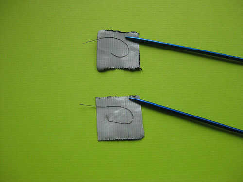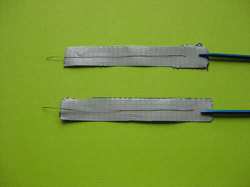 Con mucha paciencia, lugar un trozo de hilo conductor en la parte superior la cinta adhesiva que cubre la zona que desea ser sensibles a la presión, pero en realidad sólo pone lo mínimo necesario para cubrir esta área. Demasiada superficie conductora va a arruinar la estabilidad de su sensor. Asegúrese de que un extremo del hilo está lejos de la orilla y el otro se extiende más allá del borde.