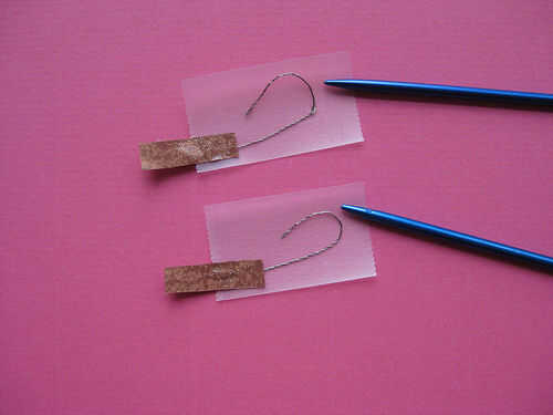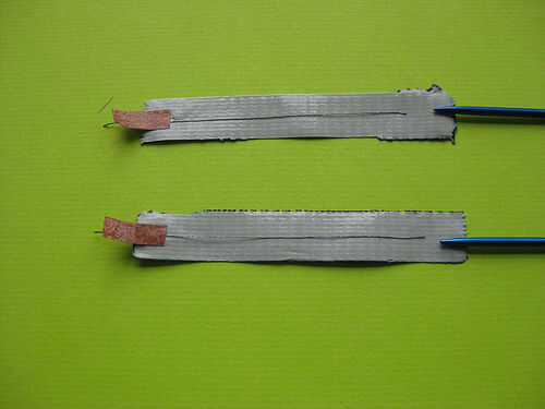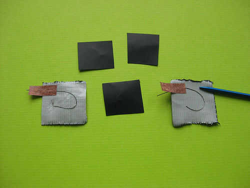Cortar dos pequeñas lengüetas de tela conductora y colocarlos en la parte superior el extremo que sobresale del hilo conductor para que la ficha media se pega a la stickytape y la otra mitad sobresale. Se aplican a ambos lados.