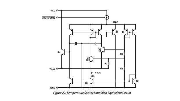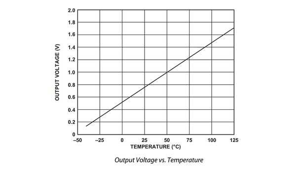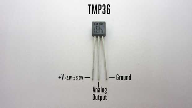 Para este proyecto estoy utilizando un circuito integrado de TMP36. Elegí este sensor ya que tiene una salida lineal y no requiere ninguna calibración. Temperatura (en grados Celsius) = [Vout(in mV) - 500] / 10. También tiene un rango muy amplio (−40 ° C a + 125 ° C"). Funciona usando varios transistores con capas de diferente tamaño emisor. Estos transistores tienen salidas diferentes a diferentes temperaturas. Comparándolos, se puede determinar la temperatura. La salida dada en el centro pin comienza a 750 mV (a 25° C) y cambios por 10mV por grado centígrado como los cambios de temperatura.