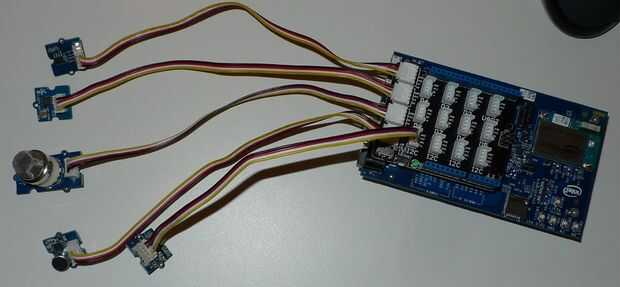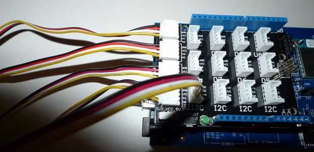 Conecte todos los sensores según la imagen de arriba. Los puertos que se utilizarán son los puertos analógicos y un puerto I2C. El sensor de los sonidos va en A0, el sensor de gas de combustión entra en A1, el sensor va en el A2, el sensor de temperatura va en A3, y el acelerometro va en el compartimiento de I2C como en la fotografía superior.