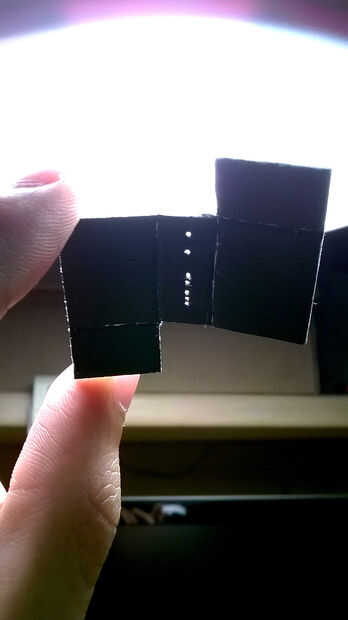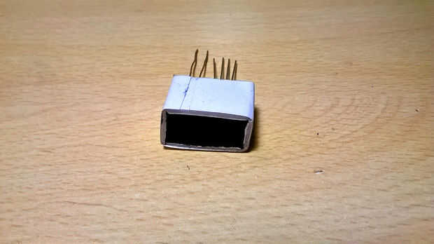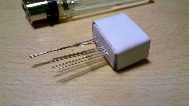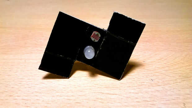 Ahora, hacer seis pequeños orificios en la pieza de cartón con una aguja: cuatro de ellos son para los pasadores LED RGB (hacerlos muy cerca uno del otro) y los otros dos son para el fotoresistor [fotos 6 y 7].