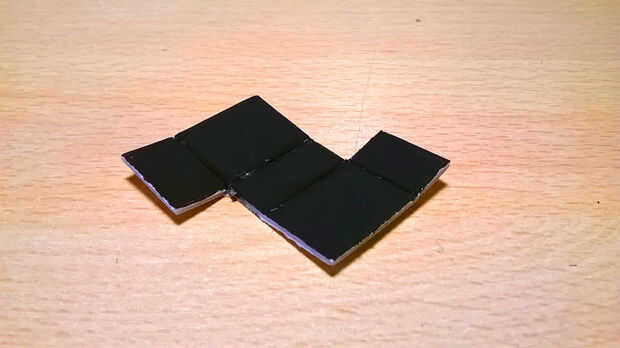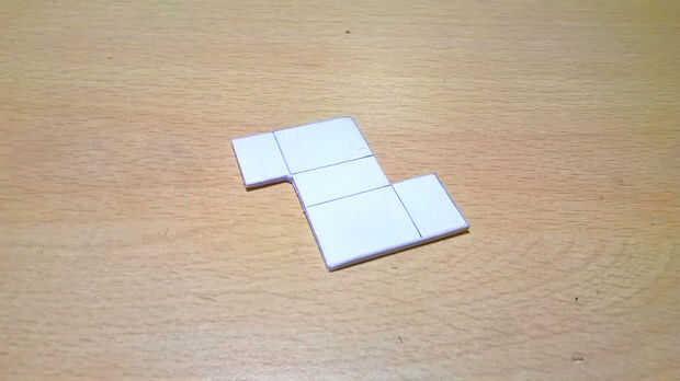Tomar la cartulina, recortar el patrón [fotos 1, 2 y 3], la pieza siguiendo las líneas del doblez (tenga cuidado, no es fácil de doblar con precisión tal un pequeño pedazo de cartón). [Imagen 4] y negro [Cuadro 5].