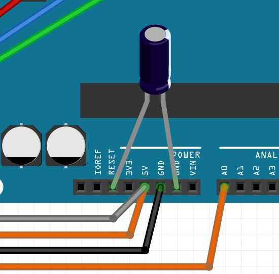prender en el pin de reset como se muestra en el cuadro 1. Este condensador se utiliza para desactivar el auto-reset que se produce cuando se establece una comunicación serial entre Arduino y un ordenador. Recuerde esto saque cuando quiera añadir nuevo código en el tablero.