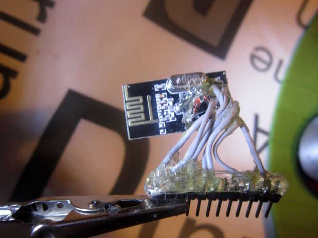 - Arduino VCC se conecta a través de tres diodos N4007 estándar en serie al pin de VCC del módulo. Juntos los diodos bajan el voltaje de entrada por sobre 2V, justo para el módulo de radio. En mi caso el conector tiene un alambre delgado y corto, cada jefe del pin de conexión con el conector de módulo de radio. El cable VCC es un poco más corto y se conecta al ánodo del diodo primero, que cátodo en vuelta se suelda directamente al segundo diodo, que para el tercer diodo y este uno es soldado directamente a VCC del módulo.