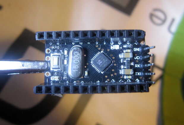 - Estos pasadores son lo que el Arduino y otros periféricos de nuestras basta cobran vida. Mira el diagrama de pines del Mini Pro y conecte el cable de tierra al pin GND del Arduino y 5V al pin de VCC de Arduino. Yo utiliza pines macho en el Arduino y headers hembra en los cables de la fuente de alimentación.