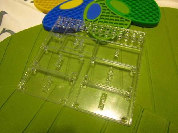 Mi primer nodo tiene 7 elementos cada una de ellas es un pequeño PCB para que laser-corte un tablero acrílico base al servidor como el soporte mecánico para él, hay probablemente mucho mejores formas de hacerlo.