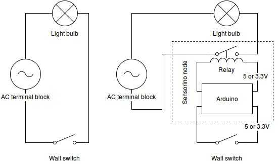 En un multimodo de instalación normal (wikipedia) necesidades de conmutación un tipo especial de circuito con los interruptores están en una especie de conexión en serie con los demás y la lámpara. Sensorino efectivamente no cuidado y sólo para conectar las luces por separado y cada interruptor por separado. El sketch de Arduino hará la conmutación de multiway.