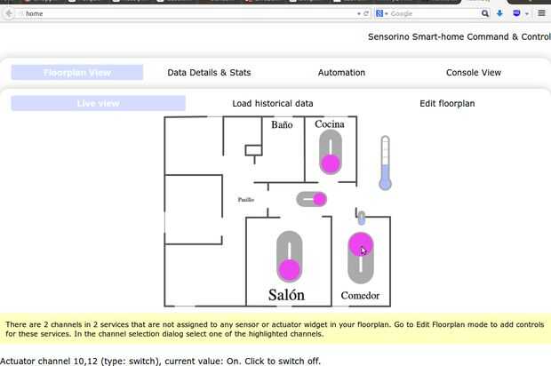 Cuando usted carga http://routers_addr:8000 / se abrirá la interfaz de web Sensorino y si el servidor ha detectado cualquier nuevo nodos allí será mensaje diciendo que ahora puede entrar en el editor de plano y colocar tus widgets sensor y actuador visualmente. Puede rotar/redimensionarlos, dibujar algunas paredes para hacer el plano menos vacío, etc.. La interfaz debe ser bastante intuitiva.