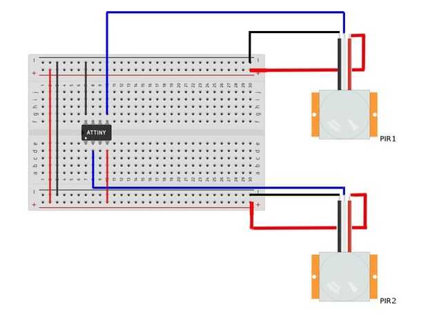 Permítanos primero conectarse los dos sensores PIR ATTiny85