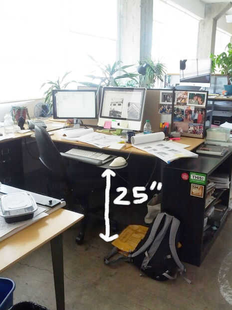 Este es mi escritorio... un poco menos prestine que la imagen anterior:) Medí la altura de la bandeja de teclado existentes (o mesa si no utilizas una bandeja para el teclado).  En mi caso es 25" del suelo.