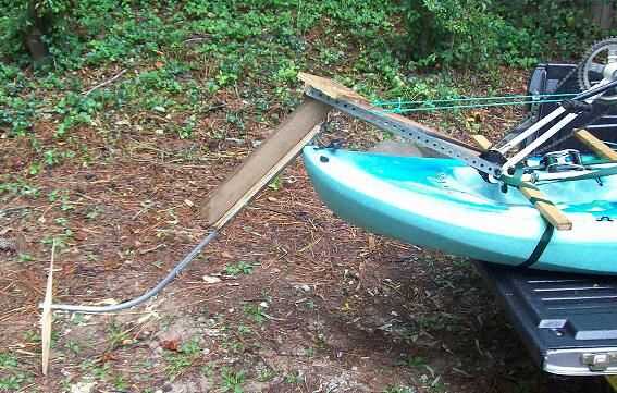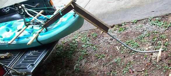 Tengo un kayak de 13 pies y un garaje lleno de gente, y almacenaje horizontal (utilizando un sistema de polea para una bicicleta) era problemático. Por suerte mi garaje lleno de gente tiene un bonito techo alto con vigas a la vista, así que pude aseg