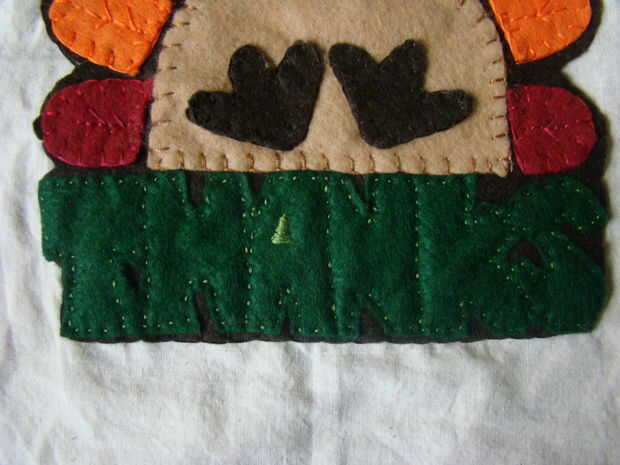 Acabé haciendo la palabra «gracias» dos veces. Ambas veces he utilizado la puntada corriente a delinear cada una de las letras de la obra, pero la primera vez, usé hilo dk. verde que coincidió con el fieltro. Gran error, se podían ver las puntadas y así no leer la palabra. Así que con un color más claro de la misma clase de verde redid. Usé una puntada para llenar en su totalidad en la letra A. del capital Ahora usted puede leer la palabra.
