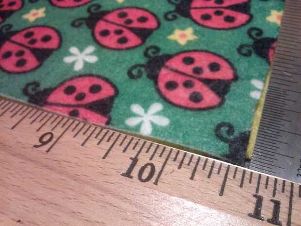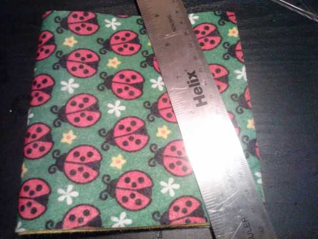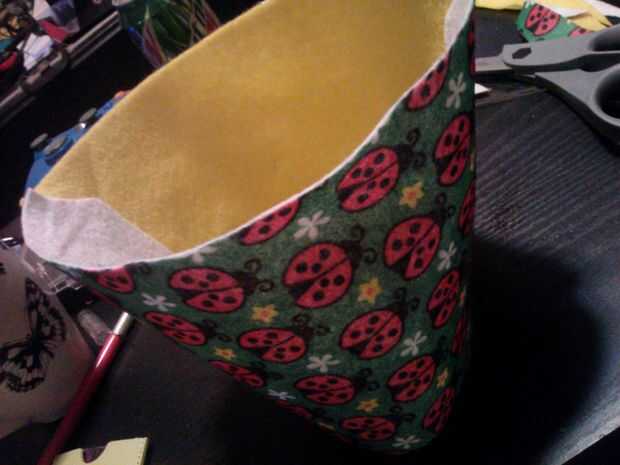 No tengo una hoja completa del amarillo, así que corte todo lo posible para encajar lo que tenía. Terminó siendo 10 1/2 pulgadas por 5 1/4. Hora de decidir cómo hacer suyo, recuerde que debe ser amplio y corto (paisaje, retrato no), así que trate de juntar los extremos y rodantes en forma de cubo-como medir. Usted necesitará dos hojas para el cuerpo de la cesta. Después de tener sus dos rectángulos idénticos, poner uno encima del otro, mirando hacia adentro, por lo que después se pegan los extremos, será dentro de los patrones. Si tiene dos hojas con dibujos, el patrón debe estar uno frente al otro. Doble en estilo medio "hamburguesa", manteniendo los bordes alineados. Use la regla para hacer una línea diagonal de una de las esquinas, el borde abierto, igual en la foto. Puede utilizar un marcador de la tela para dibujar la línea, luego corte a lo largo de la línea. Apenas corté sin trazar la línea. Como he dicho antes, puede utilizar una máquina de coser o incluso mano puntada la parte juntos, pero he utilizado pegamento caliente. Asegurándose de que los lados estampados están uno frente al otro y los lados con estampado no son hacia fuera, pegamento entre las capas de fieltro a lo largo de los lados de la diagonal. Cuando usted vuelva a dentro hacia fuera, los patrones deben estar en el exterior y debe ser una forma de tubo con una abertura más pequeña que la otra. Pegué las costuras abajo de plano en el interior (ver última foto).