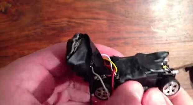 Tomar el circuito de la cámara y fíjelo a la parte media del coche rc con una cinta aislante. No bulto la cinta alrededor del coche, pero alrededor de lazo para sujetar la platina completamente.