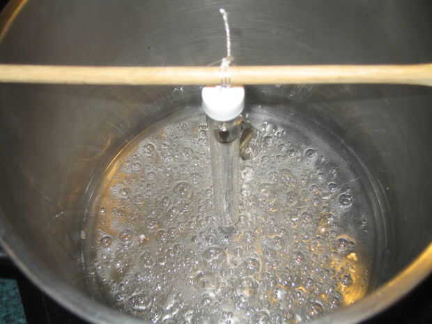 poco a poco añadir el azúcar, jarabe de maíz, agua y crema de tartar revolviendo todo el tiempo cuando esta mezcla comienza a hervir. Dejar de revolver, saca su termómetro de caramelo y coloque en la mezcla. Tenga cuidado de que el termómetro no toque los lados o el fondo de la olla. Si esto sucede, podría interferir con la temperatura de la mezcla te recomiendo hacer lo que he hecho y suspender el termómetro de caramelo para que apenas toca la mezcla con un trozo de cadena y una cuchara de madera. Cuando la mezcla alcanza aproximadamente 300° F (o crack dura etapa por todo lo que candy entusiastas por ahí) retirar inmediatamente del fuego