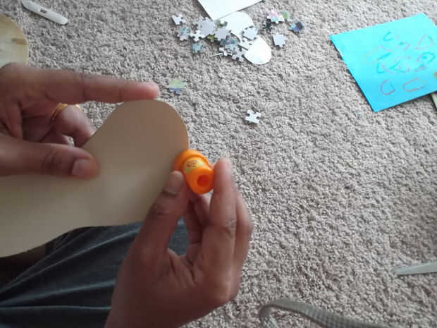 Materiales: papel cartulina, pegamento, aribbon, lápiz, cuchillo de corte, piedras de un sello y reinado