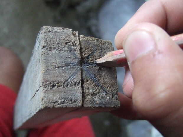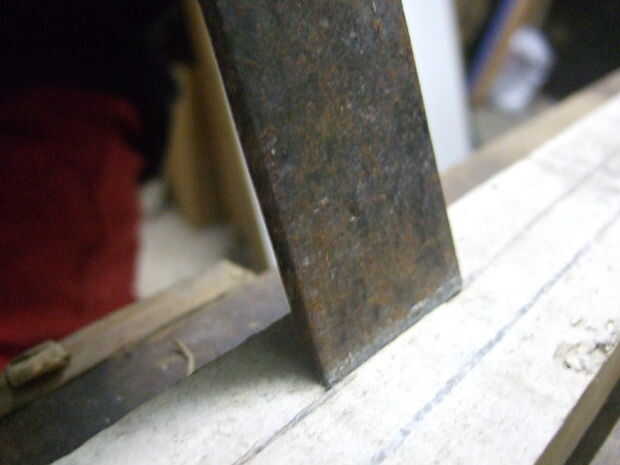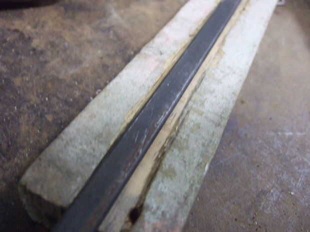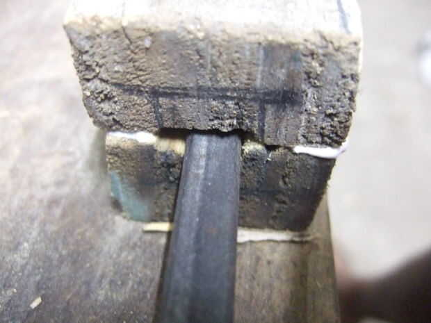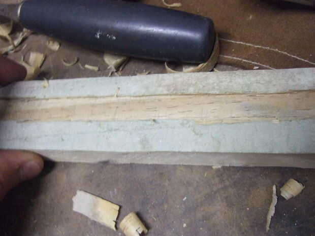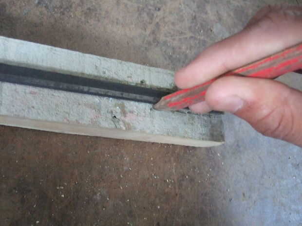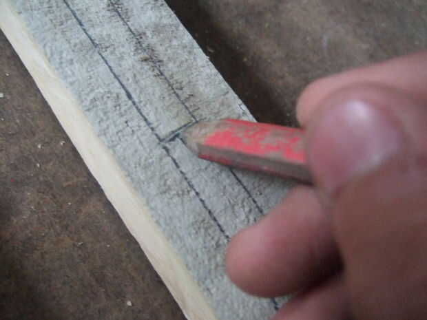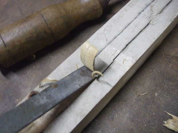 Marca con un lápiz en la parte interna donde la lámina será de en la base de 10cm, para que la hoja no era hasta el final. Marqué el riesgo con el cincel grande y con el cincel ligeramente más grande que la hoja que corte la parte que quedo.