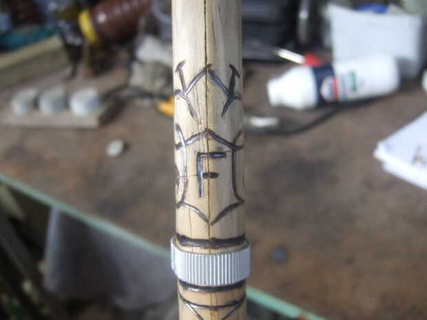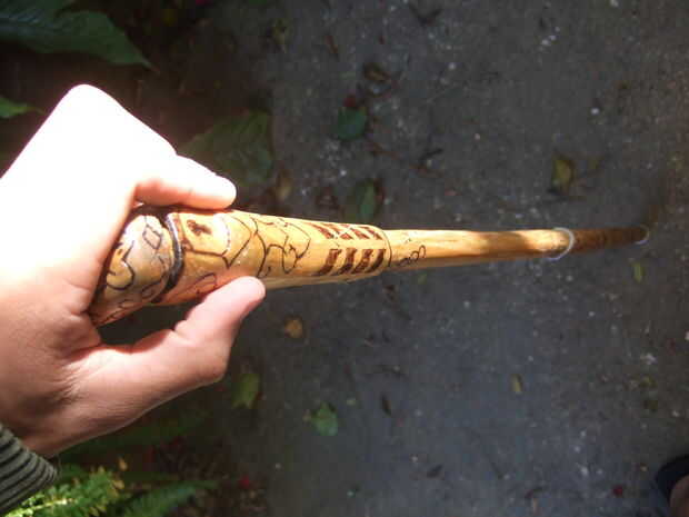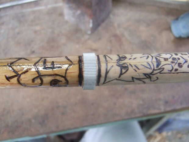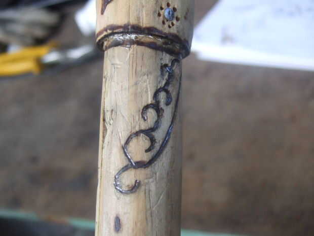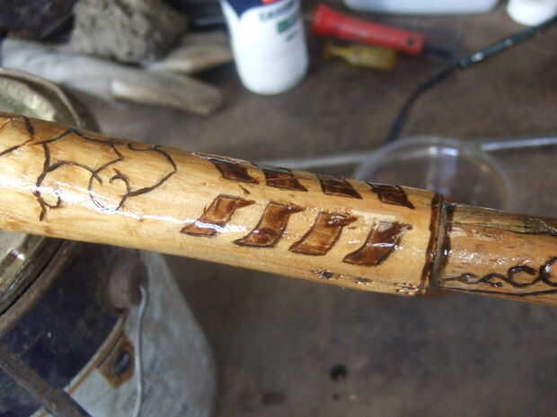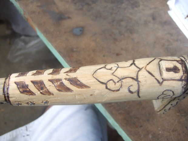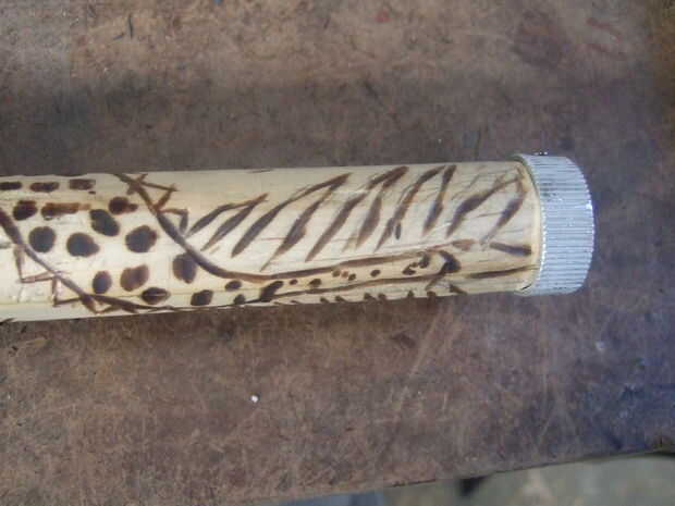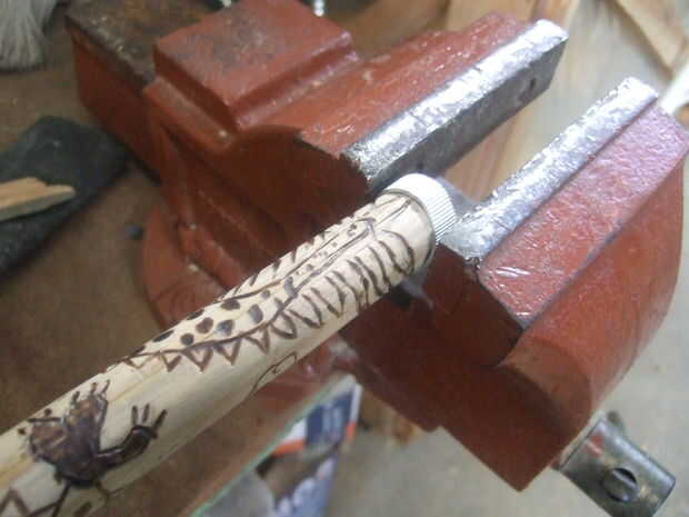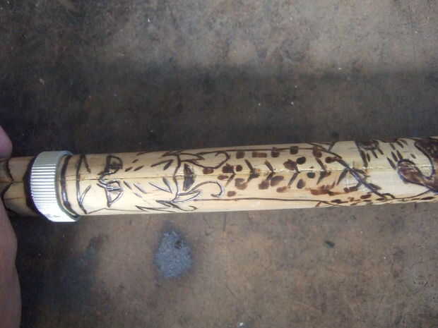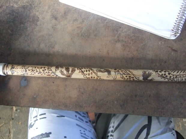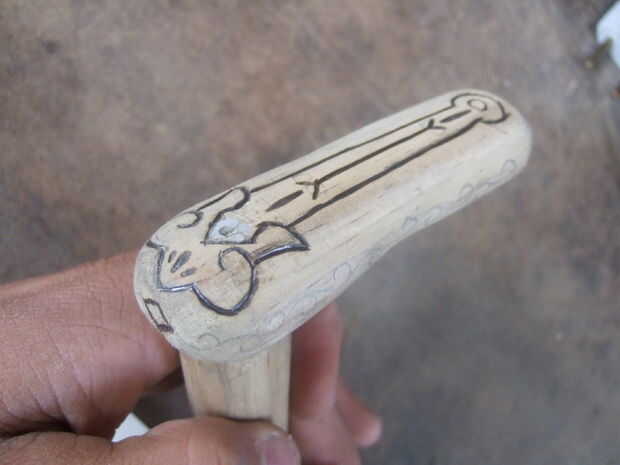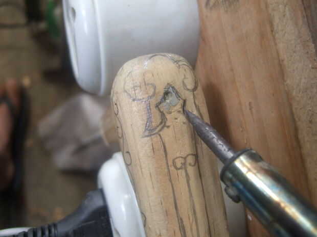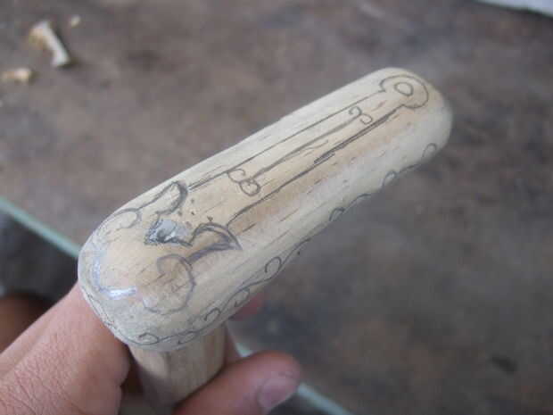 Dibujaba en la pieza con un lápiz y luego tallar usando un soldador para quemar la madera. Después los dibujos listos pasé barniz.