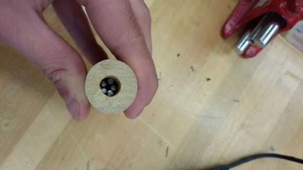Después de que los pesos están situados en el pasador de madera, pegamento de la parada para crear una pieza sólida de madera.