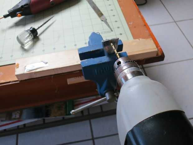 Taladro en el cuerpo para colocar ganchos y agujeros en el frente para la inserción de un tornillo de máquina. La tuerca y la cabeza del tornillo se convierten en los ojos de los señuelos.