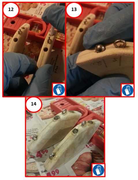 13. Presione 2 pesos en cada orificio de 1/4 de pulgada hasta que encajen completamente. Los pesos deben quedar por debajo de la barriga de los Señuelos de espacios en blanco.