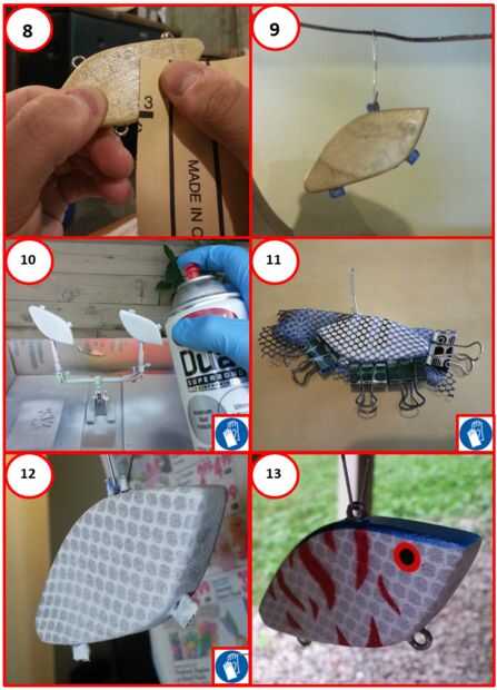 13. ser creativos y aplicar pintura de cualquier forma que desee. Usé una plantilla que hice del mismo material plástico utilizado para la plantilla de señuelos para crear rayas rojas en mis señuelos. También utiliza pintura en aerosol azul para cubrir el lomo del señuelo y terminó agregando un palo rojo en el ojo. Una cosa a tener en cuenta cuando la pintura a pistola es over-spray. Los señuelos son pequeños y puede ser difícil crear líneas limpias con pintura de aerosol. Para asegurarse de limpiar líneas cuando la pintura a pistola, cinta de uso pintor para cubrir todas las superficies donde no desea que la pintura le utilizan para subirse.