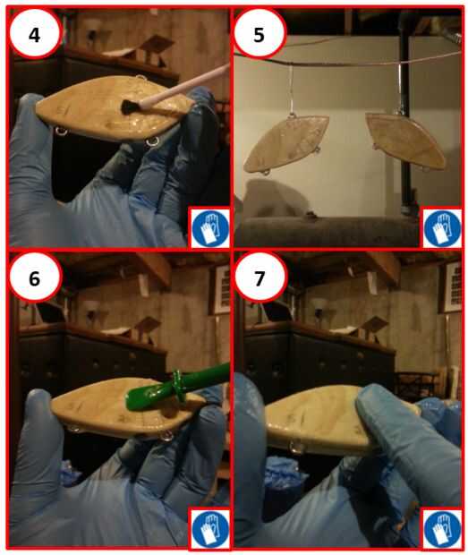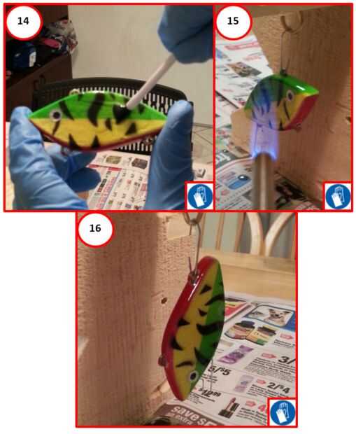 5. una vez que los señuelos están completamente cubiertos en EnviroTex, colgar a secar durante 20 minutos.