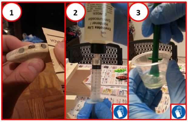 3. dispensar la resina y el endurecedor de las jeringas en un recipiente pequeño y mezclar según las instrucciones de EnviroTex.