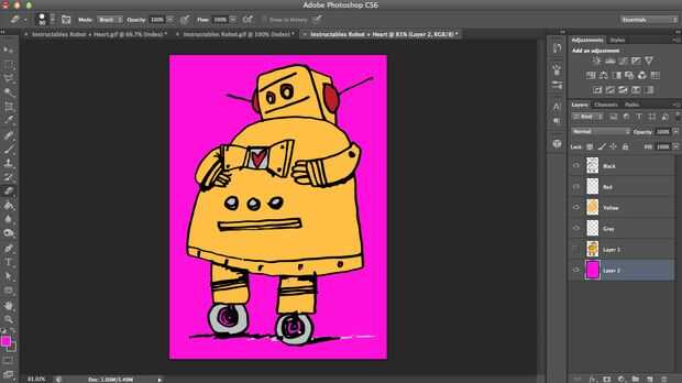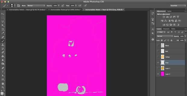 6. Hacer visible para controlar tu robot sólo sus cuatro colores. Además, asegúrese de que las capas se apilan en este mismo orden de: negro, rojo, gris, amarillo.