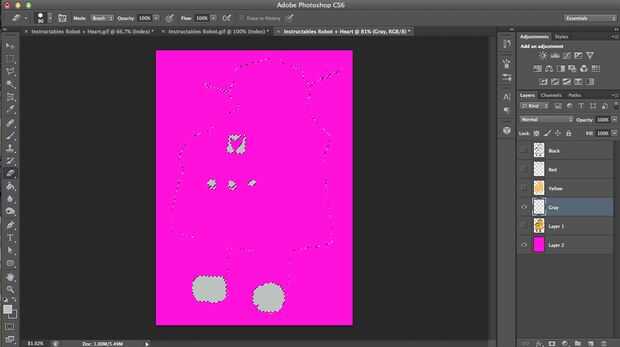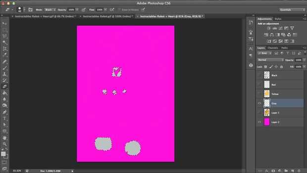 3. Haga clic con el botón derecho la capa gris para seleccionar los píxeles como antes y vas a ver los contornos de fantasmas de tu robot, que no desea. Utilizar las herramientas eraser para borrar las líneas a y luego pulse Comando/ctrl + D para deseleccionar y asegurarse de que todo está bien. También me deshice de los garabatos alrededor de las ruedas.