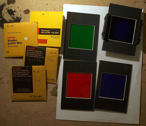 Para el registro, los geles que utilicé fueron: (Wratten números) 25 (rojo tricolor), 61 (verde intenso tricolor), 47B (tricolor azul profundo), y también probé 34 (violeta). Usted puede tratar de cualquier cosa, pero azul fuertes son bastante difíciles de encontrar. Puede ser vale la pena probar un filtro de conversión de color azul como 80A.